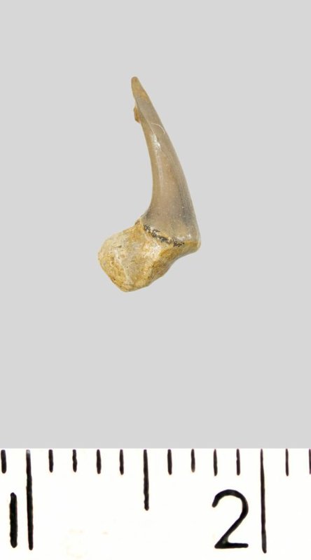 Зуб (фрагмент). Акула. Pseudoscapanorhynchus compressidens Herman 1977. Классификация: Хордовые Chordata, Позвоночные Vertebrata, Хрящевые рыбы Chondrichthyes, Пластиножаберные Elasmobranchii, Акулы Selachii, Ламнообразные Lamniformes, Pseudoscapanorhynchidae