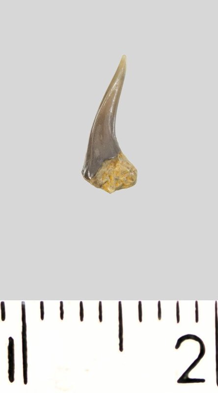 Зуб (фрагмент). Акула. Pseudoscapanorhynchus compressidens Herman 1977. Классификация: Хордовые Chordata, Позвоночные Vertebrata, Хрящевые рыбы Chondrichthyes, Пластиножаберные Elasmobranchii, Акулы Selachii, Ламнообразные Lamniformes, Pseudoscapanorhynchidae