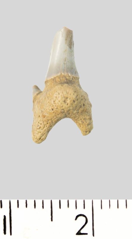 Зуб. Акула. Pseudoscapanorhynchus compressidens Herman 1977. Классификация: Хордовые Chordata, Позвоночные Vertebrata, Хрящевые рыбы Chondrichthyes, Пластиножаберные Elasmobranchii, Акулы Selachii, Ламнообразные Lamniformes, Pseudoscapanorhynchidae