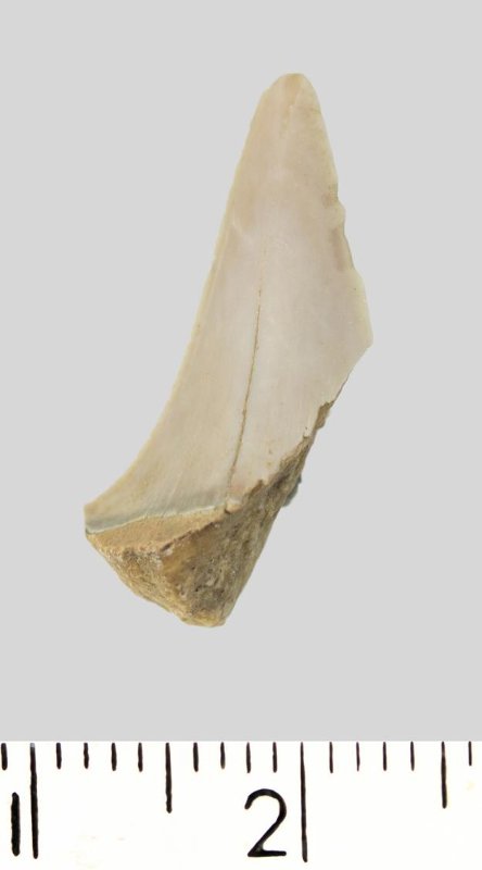 Зуб (фрагмент). Акула. Cretoxyrhina denticulata (Glueckman, 1957). Классификация: Хордовые Chordata, Позвоночные Vertebrata, Хрящевые рыбы Chondrichthyes, Пластиножаберные Elasmobranchii, Акулы Selachii, Ламнообразные Lamniformes, Cretoxyrhinidae