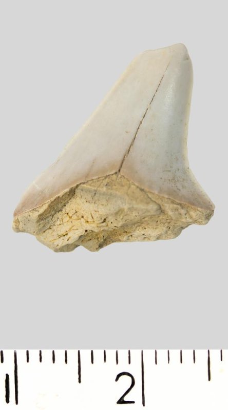 Зуб (фрагмент). Акула. Cretoxyrhina denticulata (Glueckman, 1957). Классификация: Хордовые Chordata, Позвоночные Vertebrata, Хрящевые рыбы Chondrichthyes, Пластиножаберные Elasmobranchii, Акулы Selachii, Ламнообразные Lamniformes, Cretoxyrhinidae