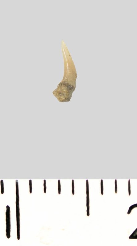 Зуб (фрагмент). Акула. Odontaspis striatula Dalinkevicius, 1935. Классификация: Хордовые Chordata, Позвоночные Vertebrata, Хрящевые рыбы Chondrichthyes, Пластиножаберные Elasmobranchii, Акулы Selachii, Ламнообразные Lamniformes, Песчаные акулы Odontaspididae