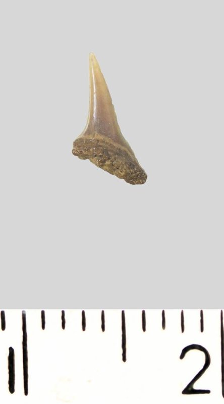 Зуб (фрагмент). Акула. Odontaspis striatula Dalinkevicius, 1935. Классификация: Хордовые Chordata, Позвоночные Vertebrata, Хрящевые рыбы Chondrichthyes, Пластиножаберные Elasmobranchii, Акулы Selachii, Ламнообразные Lamniformes, Песчаные акулы Odontaspididae