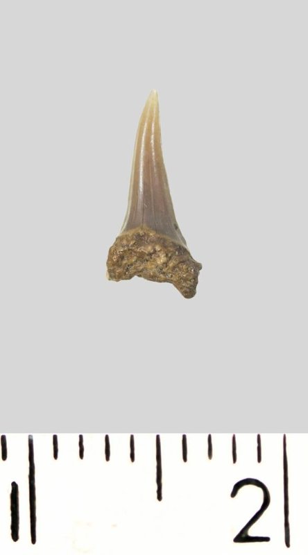 Зуб (фрагмент). Акула. Odontaspis striatula Dalinkevicius, 1935. Классификация: Хордовые Chordata, Позвоночные Vertebrata, Хрящевые рыбы Chondrichthyes, Пластиножаберные Elasmobranchii, Акулы Selachii, Ламнообразные Lamniformes, Песчаные акулы Odontaspididae