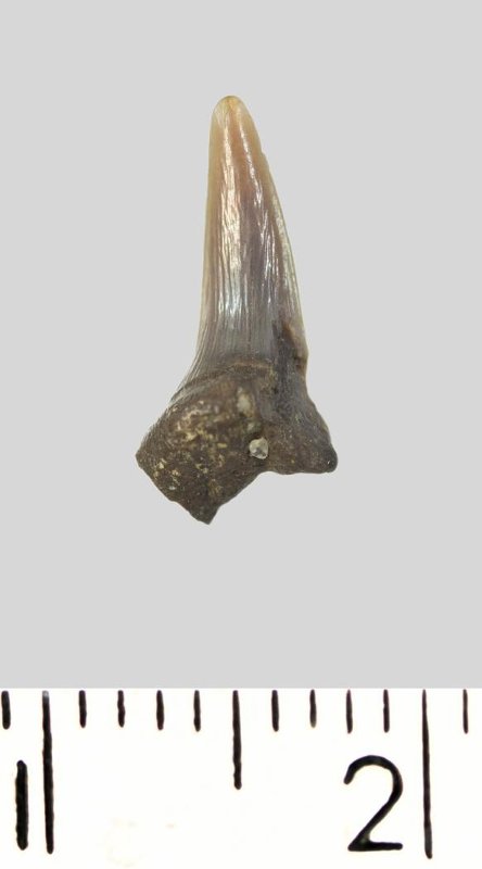 Зуб (фрагмент). Акула. Odontaspis striatula Dalinkevicius, 1935. Классификация: Хордовые Chordata, Позвоночные Vertebrata, Хрящевые рыбы Chondrichthyes, Пластиножаберные Elasmobranchii, Акулы Selachii, Ламнообразные Lamniformes, Песчаные акулы Odontaspididae