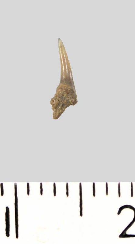 Зуб. Акула. Odontaspis striatula Dalinkevicius, 1935. Классификация: Хордовые Chordata, Позвоночные Vertebrata, Хрящевые рыбы Chondrichthyes, Пластиножаберные Elasmobranchii, Акулы Selachii, Ламнообразные Lamniformes, Песчаные акулы Odontaspididae