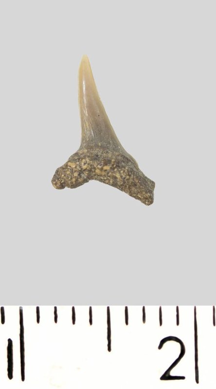 Зуб. Акула. Odontaspis striatula Dalinkevicius, 1935. Классификация: Хордовые Chordata, Позвоночные Vertebrata, Хрящевые рыбы Chondrichthyes, Пластиножаберные Elasmobranchii, Акулы Selachii, Ламнообразные Lamniformes, Песчаные акулы Odontaspididae