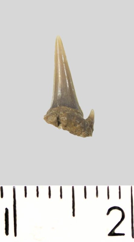 Зуб. Акула. Odontaspis striatula Dalinkevicius, 1935. Классификация: Хордовые Chordata, Позвоночные Vertebrata, Хрящевые рыбы Chondrichthyes, Пластиножаберные Elasmobranchii, Акулы Selachii, Ламнообразные Lamniformes, Песчаные акулы Odontaspididae