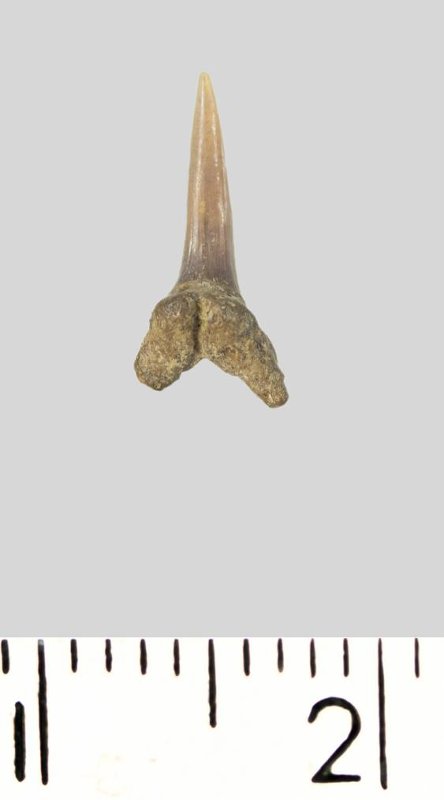 Зуб. Акула. Odontaspis striatula Dalinkevicius, 1935. Классификация: Хордовые Chordata, Позвоночные Vertebrata, Хрящевые рыбы Chondrichthyes, Пластиножаберные Elasmobranchii, Акулы Selachii, Ламнообразные Lamniformes, Песчаные акулы Odontaspididae