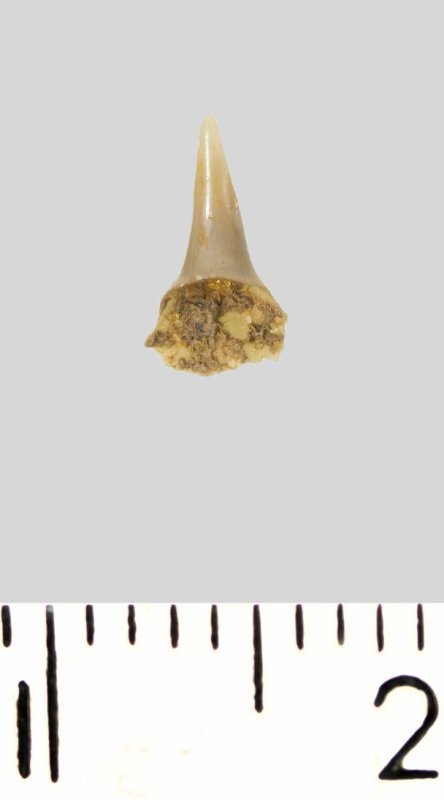 Зуб (фрагмент). Акула. Synechodus dubrisiensis (Mackie, 1863). Классификация: Хордовые Chordata, Позвоночные Vertebrata, Хрящевые рыбы Chondrichthyes, Пластиножаберные Elasmobranchii, Акулы Selachii, Синеходонтообразные Synechodontiformes, Palaeospinacidae