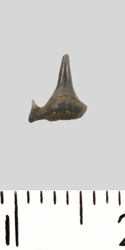 Зуб (фрагмент). Акула. Synechodus dubrisiensis (Mackie, 1863). Классификация: Хордовые Chordata, Позвоночные Vertebrata, Хрящевые рыбы Chondrichthyes, Пластиножаберные Elasmobranchii, Акулы Selachii, Синеходонтообразные Synechodontiformes, Palaeospinacidae