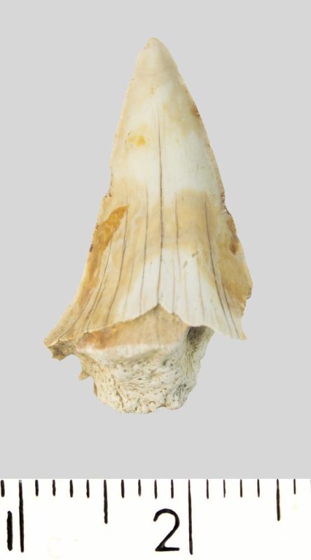Зуб (фрагмент). Акула. Cretoxyrhina denticulata (Glueckman, 1957). Классификация: Хордовые Chordata, Позвоночные Vertebrata, Хрящевые рыбы Chondrichthyes, Пластиножаберные Elasmobranchii, Акулы Selachii, Ламнообразные Lamniformes, Cretoxyrhinidae