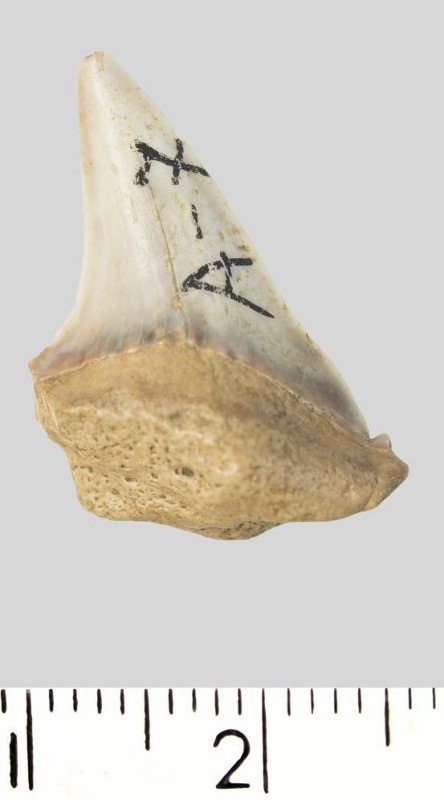 Зуб (фрагмент). Акула. Cretoxyrhina denticulata (Glueckman, 1957). Классификация: Хордовые Chordata, Позвоночные Vertebrata, Хрящевые рыбы Chondrichthyes, Пластиножаберные Elasmobranchii, Акулы Selachii, Ламнообразные Lamniformes, Cretoxyrhinidae