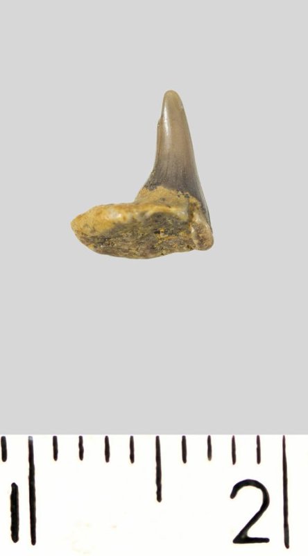 Зуб (фрагмент). Акула. Synechodus dubrisiensis (Mackie, 1863). Классификация: Хордовые Chordata, Позвоночные Vertebrata, Хрящевые рыбы Chondrichthyes, Пластиножаберные Elasmobranchii, Акулы Selachii, Синеходонтообразные Synechodontiformes, Palaeospinacidae