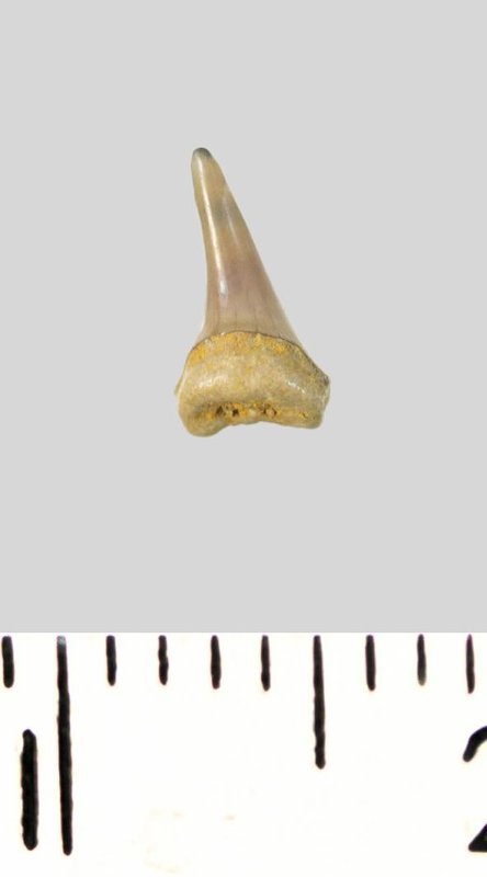 Зуб (фрагмент). Акула. Synechodus dubrisiensis (Mackie, 1863). Классификация: Хордовые Chordata, Позвоночные Vertebrata, Хрящевые рыбы Chondrichthyes, Пластиножаберные Elasmobranchii, Акулы Selachii, Синеходонтообразные Synechodontiformes, Palaeospinacidae