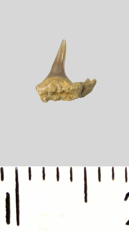 Зуб (фрагмент). Акула. Synechodus dubrisiensis (Mackie, 1863). Классификация: Хордовые Chordata, Позвоночные Vertebrata, Хрящевые рыбы Chondrichthyes, Пластиножаберные Elasmobranchii, Акулы Selachii, Синеходонтообразные Synechodontiformes, Palaeospinacidae