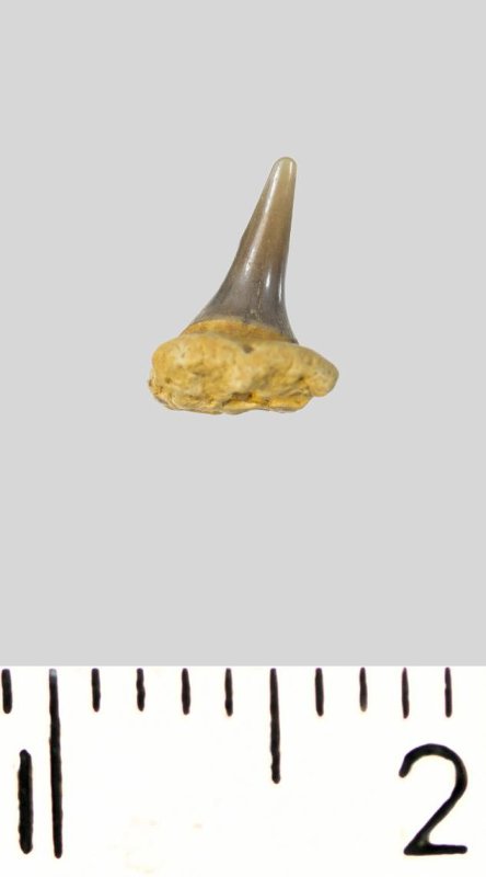 Зуб (фрагмент). Акула. Synechodus dubrisiensis (Mackie, 1863). Классификация: Хордовые Chordata, Позвоночные Vertebrata, Хрящевые рыбы Chondrichthyes, Пластиножаберные Elasmobranchii, Акулы Selachii, Синеходонтообразные Synechodontiformes, Palaeospinacidae