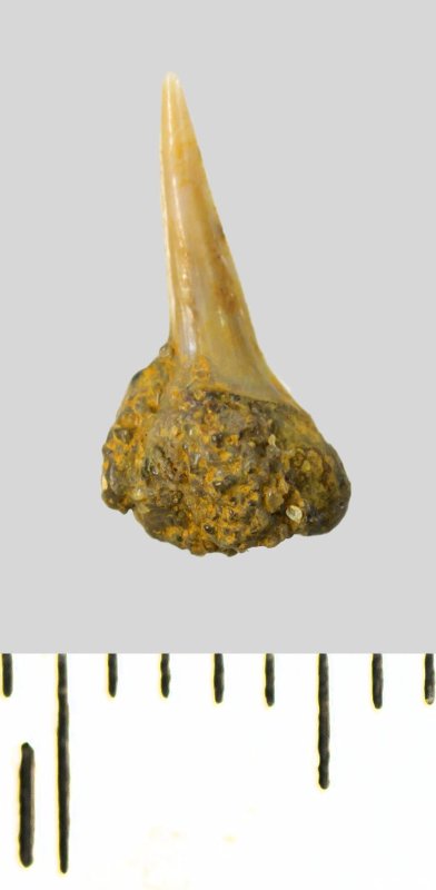 Зуб. Акула. Odontaspis subulata (Agassiz, 1843). Классификация: Хордовые Chordata, Позвоночные Vertebrata, Хрящевые рыбы Chondrichthyes, Пластиножаберные Elasmobranchii, Акулы Selachii, Ламнообразные Lamniformes, Песчаные акулы Odontaspididae