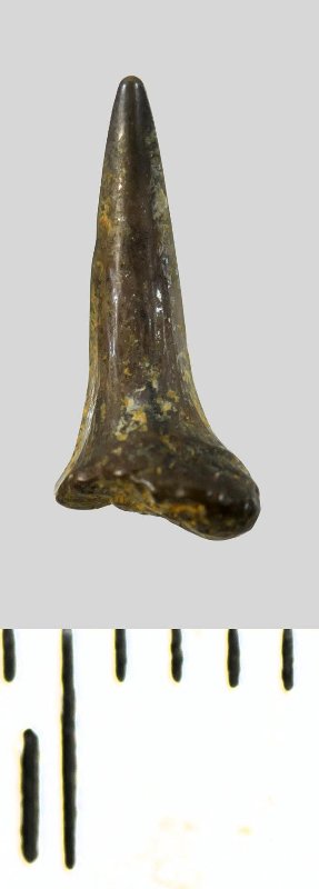Зуб (фрагмент). Акула. Odontaspis subulata (Agassiz, 1843). Классификация: Хордовые Chordata, Позвоночные Vertebrata, Хрящевые рыбы Chondrichthyes, Пластиножаберные Elasmobranchii, Акулы Selachii, Ламнообразные Lamniformes, Песчаные акулы Odontaspididae
