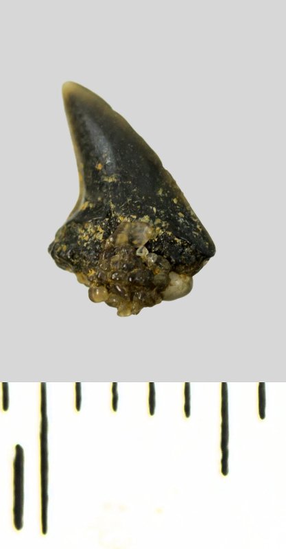 Зуб (фрагмент). Акула. Odontaspis subulata (Agassiz, 1843). Классификация: Хордовые Chordata, Позвоночные Vertebrata, Хрящевые рыбы Chondrichthyes, Пластиножаберные Elasmobranchii, Акулы Selachii, Ламнообразные Lamniformes, Песчаные акулы Odontaspididae
