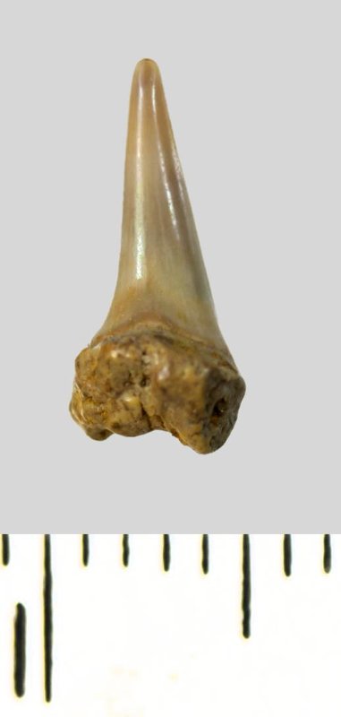 Зуб (фрагмент). Акула. Odontaspis subulata (Agassiz, 1843). Классификация: Хордовые Chordata, Позвоночные Vertebrata, Хрящевые рыбы Chondrichthyes, Пластиножаберные Elasmobranchii, Акулы Selachii, Ламнообразные Lamniformes, Песчаные акулы Odontaspididae