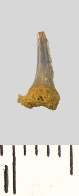 Зуб (фрагмент). Акула. Odontaspis subulata (Agassiz, 1843). Классификация: Хордовые Chordata, Позвоночные Vertebrata, Хрящевые рыбы Chondrichthyes, Пластиножаберные Elasmobranchii, Акулы Selachii, Ламнообразные Lamniformes, Песчаные акулы Odontaspididae