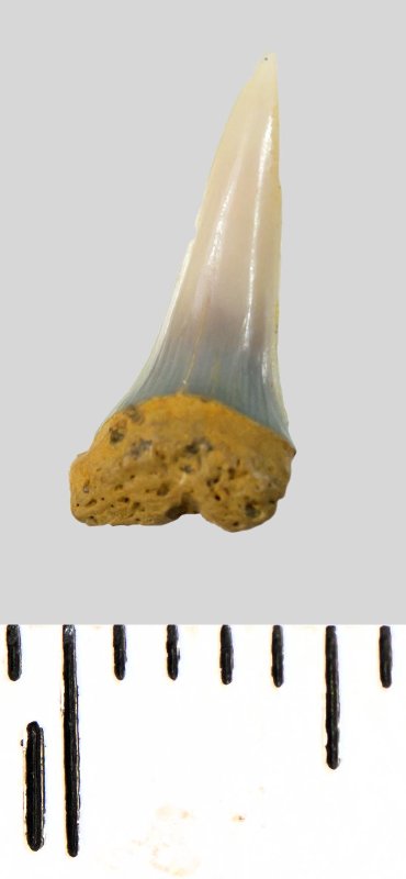 Зуб (фрагмент). Акула. Odontaspis subulata (Agassiz, 1843). Классификация: Хордовые Chordata, Позвоночные Vertebrata, Хрящевые рыбы Chondrichthyes, Пластиножаберные Elasmobranchii, Акулы Selachii, Ламнообразные Lamniformes, Песчаные акулы Odontaspididae