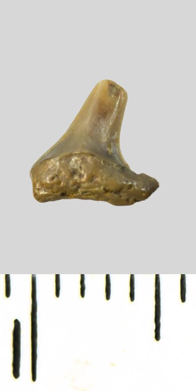 Зуб (фрагмент). Акула. Odontaspis subulata (Agassiz, 1843). Классификация: Хордовые Chordata, Позвоночные Vertebrata, Хрящевые рыбы Chondrichthyes, Пластиножаберные Elasmobranchii, Акулы Selachii, Ламнообразные Lamniformes, Песчаные акулы Odontaspididae