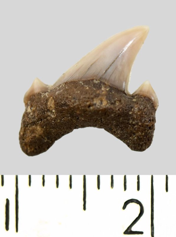 Зуб. Акула. Archaeolamna cf. kopingensis (Davis, 1890). Классификация: Хордовые Chordata, Позвоночные Vertebrata, Хрящевые рыбы Chondrichthyes, Пластиножаберные Elasmobranchii, Акулы Selachii, Ламнообразные Lamniformes, Cretoxyrhinidae