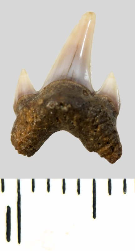 Зуб. Акула. Archaeolamna cf. kopingensis (Davis, 1890). Классификация: Хордовые Chordata, Позвоночные Vertebrata, Хрящевые рыбы Chondrichthyes, Пластиножаберные Elasmobranchii, Акулы Selachii, Ламнообразные Lamniformes, Cretoxyrhinidae