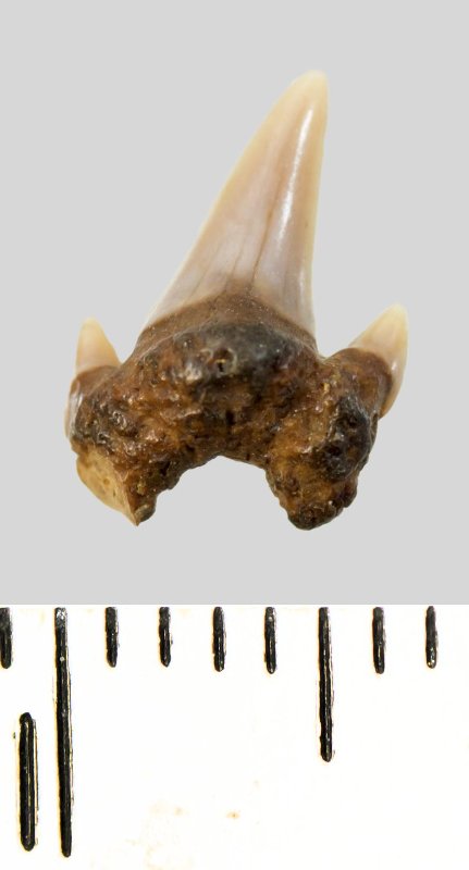 Зуб. Акула. Protolamna cf. sokolovi Capetta, 1980. Классификация: Хордовые Chordata, Позвоночные Vertebrata, Хрящевые рыбы Chondrichthyes, Пластиножаберные Elasmobranchii, Акулы Selachii, Ламнообразные Lamniformes, Pseudoscapanorhynchidae
