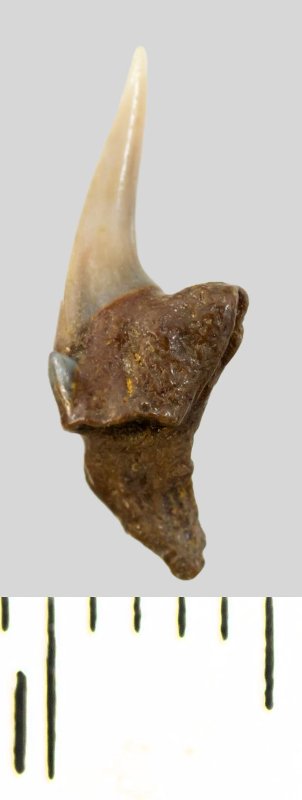 Зуб. Акула. Pseudoscapanorhynchus compressidens ( Herman 1977). Классификация: Хордовые Chordata, Позвоночные Vertebrata, Хрящевые рыбы Chondrichthyes, Пластиножаберные Elasmobranchii, Акулы Selachii, Ламнообразные Lamniformes, Pseudoscapanorhynchidae