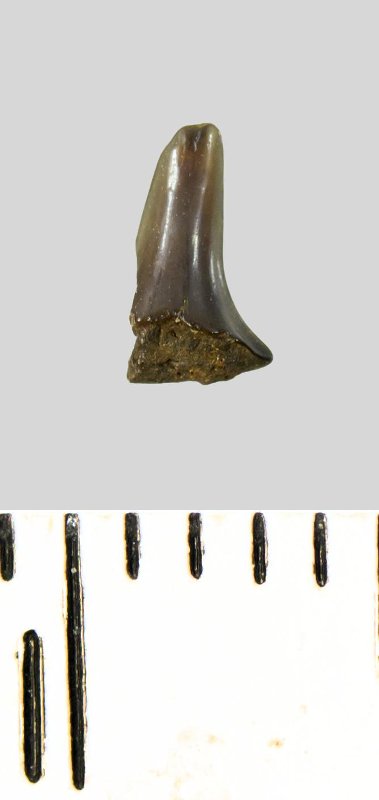 Зуб (фрагмент). Акула. Eostriatolamia subulata (Agassiz, 1843). Классификация: Хордовые Chordata, Позвоночные Vertebrata, Хрящевые рыбы Chondrichthyes, Пластиножаберные Elasmobranchii, Акулы Selachii, Ламнообразные Lamniformes, Песчаные акулы Odontaspididae