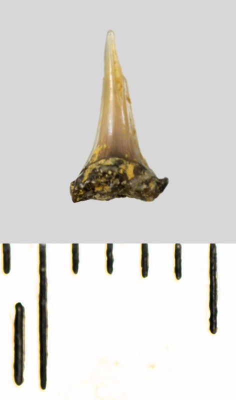 Зуб (фрагмент). Акула. Eostriatolamia subulata (Agassiz, 1843). Классификация: Хордовые Chordata, Позвоночные Vertebrata, Хрящевые рыбы Chondrichthyes, Пластиножаберные Elasmobranchii, Акулы Selachii, Ламнообразные Lamniformes, Песчаные акулы Odontaspididae