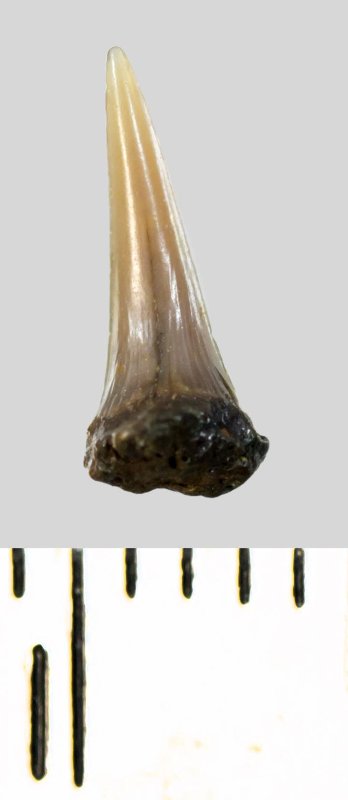 Зуб (фрагмент). Акула. Eostriatolamia subulata (Agassiz, 1843). Классификация: Хордовые Chordata, Позвоночные Vertebrata, Хрящевые рыбы Chondrichthyes, Пластиножаберные Elasmobranchii, Акулы Selachii, Ламнообразные Lamniformes, Песчаные акулы Odontaspididae