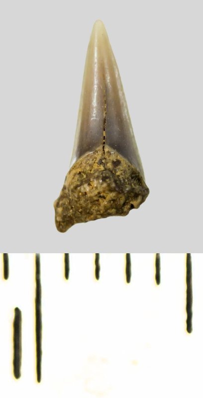 Зуб (фрагмент). Акула. Eostriatolamia subulata (Agassiz, 1843). Классификация: Хордовые Chordata, Позвоночные Vertebrata, Хрящевые рыбы Chondrichthyes, Пластиножаберные Elasmobranchii, Акулы Selachii, Ламнообразные Lamniformes, Песчаные акулы Odontaspididae
