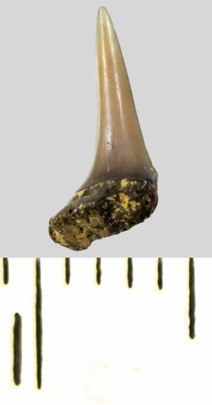 Зуб (фрагмент). Акула. Eostriatolamia subulata (Agassiz, 1843). Классификация: Хордовые Chordata, Позвоночные Vertebrata, Хрящевые рыбы Chondrichthyes, Пластиножаберные Elasmobranchii, Акулы Selachii, Ламнообразные Lamniformes, Песчаные акулы Odontaspididae