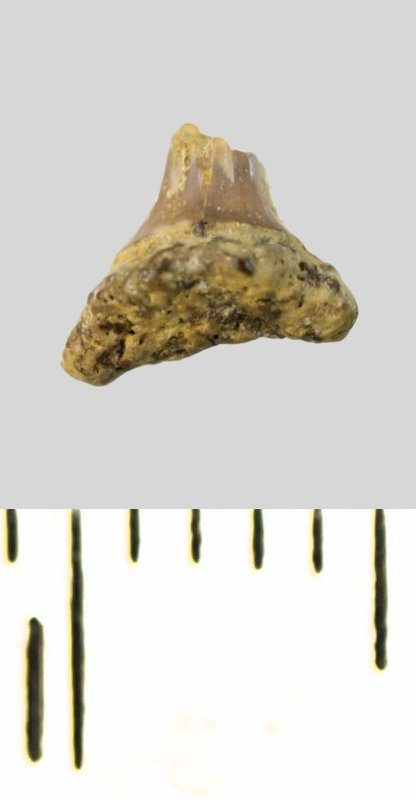 Зуб (фрагмент). Акула. Eostriatolamia subulata (Agassiz, 1843). Классификация: Хордовые Chordata, Позвоночные Vertebrata, Хрящевые рыбы Chondrichthyes, Пластиножаберные Elasmobranchii, Акулы Selachii, Ламнообразные Lamniformes, Песчаные акулы Odontaspididae
