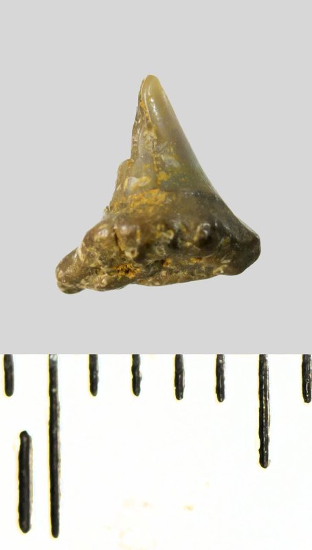 Зуб (фрагмент). Акула. Synechodus dispar (Ruess, 1845). Классификация: Хордовые Chordata, Позвоночные Vertebrata, Хрящевые рыбы Chondrichthyes, Пластиножаберные Elasmobranchii, Акулы Selachii, Синеходонтообразные Synechodontiformes, Palaeospinacidae