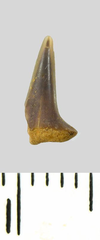 Зуб (фрагмент). Акула. Odontaspis subulata (Agassiz, 1843). Классификация: Хордовые Chordata, Позвоночные Vertebrata, Хрящевые рыбы Chondrichthyes, Пластиножаберные Elasmobranchii, Акулы Selachii, Ламнообразные Lamniformes, Песчаные акулы Odontaspididae
