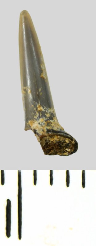 Зуб (фрагмент). Акула. Odontaspis subulata (Agassiz, 1843). Классификация: Хордовые Chordata, Позвоночные Vertebrata, Хрящевые рыбы Chondrichthyes, Пластиножаберные Elasmobranchii, Акулы Selachii, Ламнообразные Lamniformes, Песчаные акулы Odontaspididae
