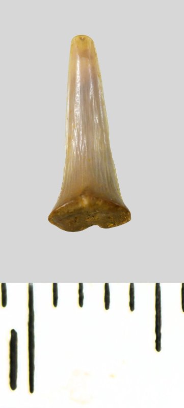 Зуб (фрагмент). Акула. Odontaspis subulata (Agassiz, 1843). Классификация: Хордовые Chordata, Позвоночные Vertebrata, Хрящевые рыбы Chondrichthyes, Пластиножаберные Elasmobranchii, Акулы Selachii, Ламнообразные Lamniformes, Песчаные акулы Odontaspididae