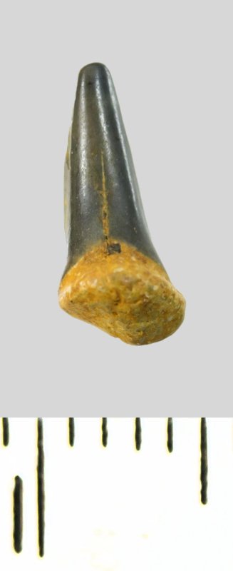 Зуб (фрагмент). Акула. Cretoxyrhinidae gen. et sp. indet. Классификация: Хордовые Chordata, Позвоночные Vertebrata, Хрящевые рыбы Chondrichthyes, Пластиножаберные Elasmobranchii, Акулы Selachii, Ламнообразные Lamniformes, Cretoxyrhinidae