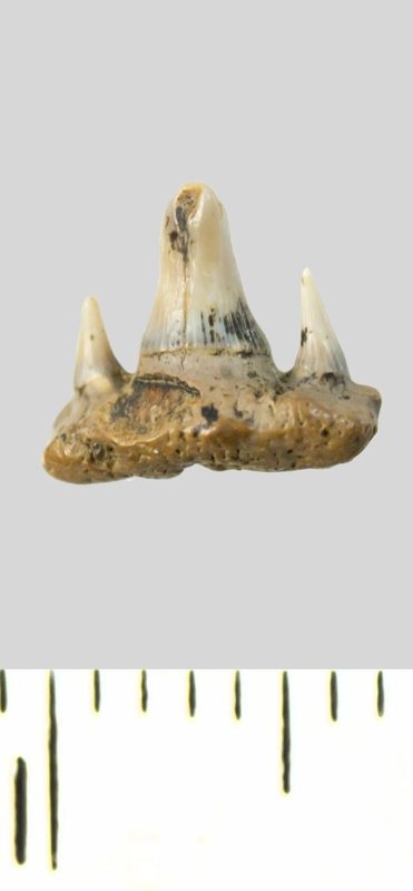 Зуб. Акула. Paraorthacodus recurvus (Trautschold, 1877). Классификация: Хордовые Chordata, Позвоночные Vertebrata, Хрящевые рыбы Chondrichthyes, Пластиножаберные Elasmobranchii, Акулы Selachii, Многожаберникообразные Hexanchiformes, Параортакодонты Paraorthacodontidae