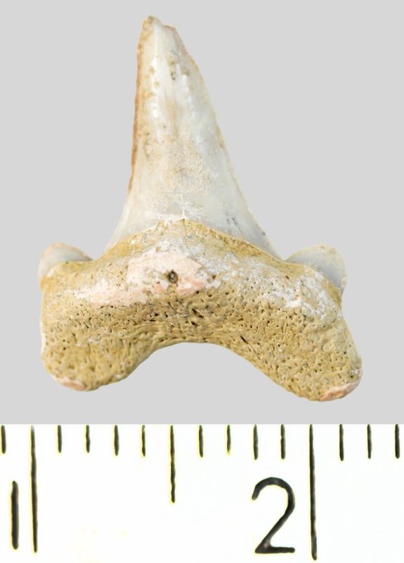 Зуб. Акула. Odontaspis macrorhiza (Cope) Leriche, 1902. Классификация: Хордовые Chordata, Позвоночные Vertebrata, Хрящевые рыбы Chondrichthyes, Пластиножаберные Elasmobranchii, Акулы Selachii, Ламнообразные Lamniformes, Cretoxyrhinidae