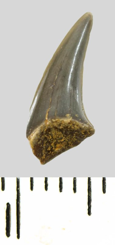 Зуб (фрагмент). Акула. Cretoxyrhinidae gen. et sp. indet. Классификация: Хордовые Chordata, Позвоночные Vertebrata, Хрящевые рыбы Chondrichthyes, Пластиножаберные Elasmobranchii, Акулы Selachii, Ламнообразные Lamniformes, Cretoxyrhinidae