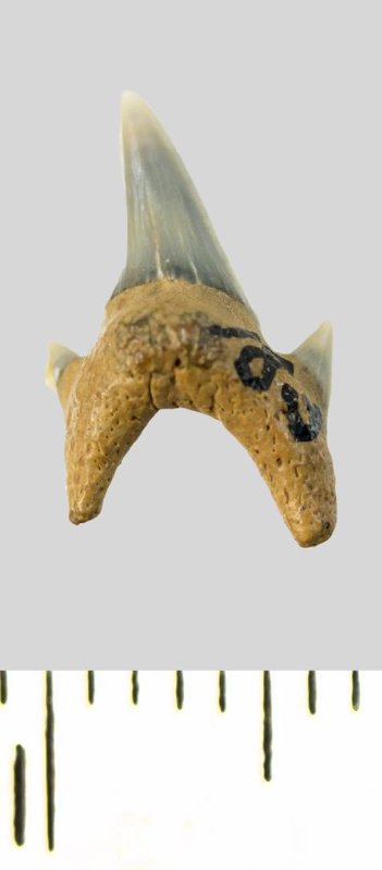 Зуб. Акула. Protolamna cf. sokolovi Capetta, 1980. Классификация: Хордовые Chordata, Позвоночные Vertebrata, Хрящевые рыбы Chondrichthyes, Пластиножаберные Elasmobranchii, Акулы Selachii, Ламнообразные Lamniformes, Pseudoscapanorhynchidae