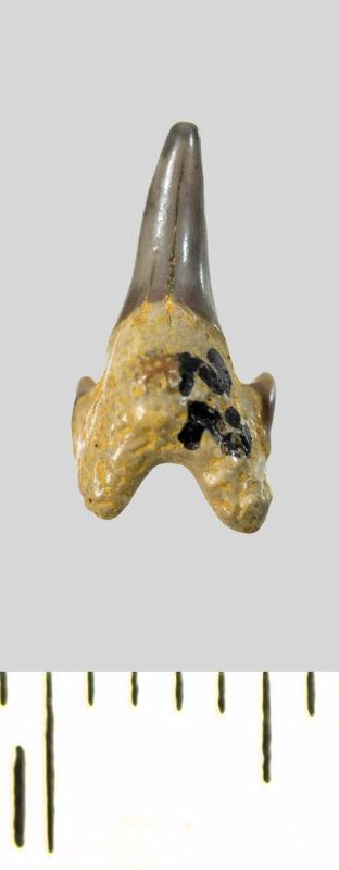 Зуб. Акула. Protolamna cf. sokolovi Capetta, 1980. Классификация: Хордовые Chordata, Позвоночные Vertebrata, Хрящевые рыбы Chondrichthyes, Пластиножаберные Elasmobranchii, Акулы Selachii, Ламнообразные Lamniformes, Pseudoscapanorhynchidae