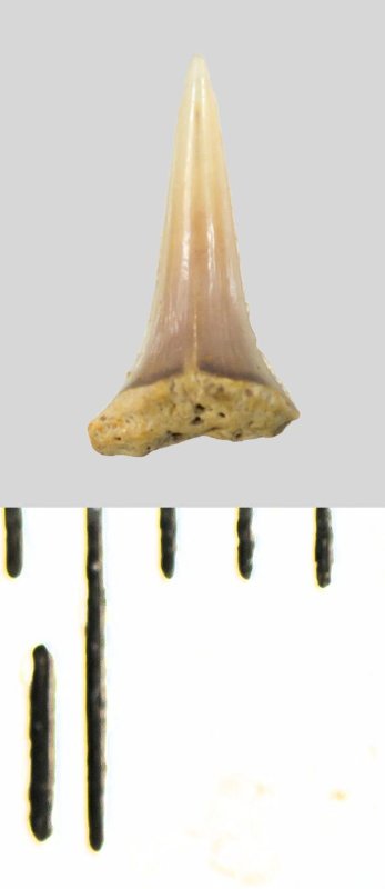Зуб (фрагмент). Акула. Eostriatolamia subulata (Agassiz, 1843). Классификация: Хордовые Chordata, Позвоночные Vertebrata, Хрящевые рыбы Chondrichthyes, Пластиножаберные Elasmobranchii, Акулы Selachii, Ламнообразные Lamniformes, Песчаные акулы Odontaspididae