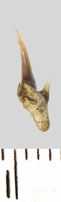 Зуб (фрагмент). Акула. Eostriatolamia subulata (Agassiz, 1843). Классификация: Хордовые Chordata, Позвоночные Vertebrata, Хрящевые рыбы Chondrichthyes, Пластиножаберные Elasmobranchii, Акулы Selachii, Ламнообразные Lamniformes, Песчаные акулы Odontaspididae